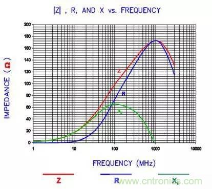 從等效電路中可以看到,當頻率低于fL(LC諧振頻率)時,磁珠呈現電感特性;當頻率等于fL時,磁珠是一個純電阻,此時磁珠的阻抗(impedance)最大;當頻率高于諧振頻率點fL時,磁珠則呈現電容特性。EMI選用磁珠的原則就是磁珠的阻抗在EMI噪聲頻率處最大。比如如果EMI噪聲的最大值在200MHz,那你選擇的時候就要看磁珠的特性曲線,其阻抗的最大值應該在200MHz左右。下圖是一個磁珠的實際的特性曲線圖。大家可以看到這個磁珠的峰值點出現在1GHz左右。在峰點時,阻抗(Z)曲線的值與電阻(R)的相等。也就是說這個磁珠在1GHz時,是個純電阻,而且阻抗值最大。
