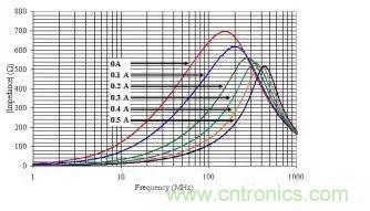 前面簡單介紹了EMI磁珠的基本特性曲線。從磁珠的阻抗曲線來看,其實它的特性就是可以用來做高頻信號濾波器。需要注意的是,通常大家看到的廠家提供的磁珠阻抗曲線,都是在無偏置電流情況下測試得到的曲線。但大部分磁珠通常被放在電源線上用來濾除電源的EMI噪聲。而在有偏置電流的情況下,磁珠的特性會發生一些變化。下面是某個0805尺寸 額定電流500mA的磁珠在不同的偏置電流下的阻抗曲線。大家可以看到,隨著電流的增加,磁珠的峰值阻抗會變小,同時阻抗峰值點的頻率也會變高。