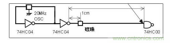 我們將兩個磁珠分別放在如下的20MHz的信號線上,看看對信號輸出會產生什么樣的影響。