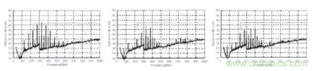 下面是上述三種情況對應的EMI測試結果。結果是磁珠A和磁珠B都會對EMI噪聲產生很大的衰減。磁珠A在整個EMI頻譜范圍內的衰減要稍好于磁珠B。