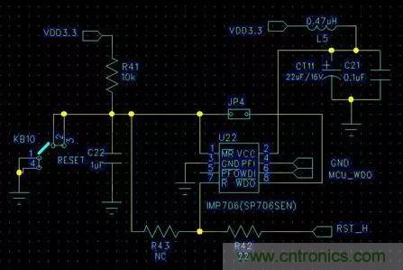 本人有一次對整機EMC整改,ESD試驗時,按鍵控制板的MCU老是復位。后來用示波器進行追蹤,發現是外部看門狗芯片發生復位,導致MCU復位。于是先在電源上并接TVS管,還是會復位;再在看門狗芯片VCC管腳旁并接22uF鉭電容,情況好一些,但還是會復位;最后再串接一個0.47uH的貼片電容,組成LC濾波(如圖3.1所示)。在+-6KV的ESD接觸放電下,就再也不會復位,而且工作正常。