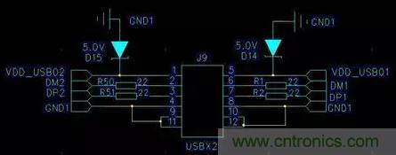特別是對于裸露在外的一些接口,比如USB、VGA、DC、SD卡等,對這些接口進行接觸放電時,靜電很容易就會“串”到電源線上,靜電由本來的共模變成了差模,此時電源上就會產生一個很高的尖峰,很多芯片都承受不了,發生死機,復位等問題。對于電源VCC的ESD保護,可以并接TVS管來解決。TVS管與穩壓二極管很相似,都有一個額定的電壓,不同的是它的響應速度特別快,對靜電有很好的泄放作用。例如對于USB接口(見圖1.1、圖1.2),VCC和外殼地之間并接5V的TVS管。相當于把電源和地鉗位在5V以內,這樣可以有效地把靜電電流導向地,達到效果很明顯。要注意的是布局布線的時候,TVS管要盡量靠近接口的位置,TVS的陰極以最近的路徑接到接口的外殼地(如果有的話)。