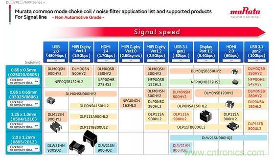 這次,我們介紹了針對USB 3.1 gen 1噪聲對策的噪聲對策示例,但除此之外,我們還介紹了適用于高速差分接口噪聲對策的共模噪聲濾波器/共模扼流線圈。 請參考下面的選擇表。