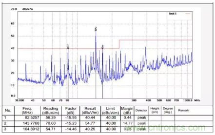 某行車記錄儀,測試的時候要加一個外接適配器,在機器上電運行測試時發現超標,具體頻點是84MHZ、144MH、168MHZ,需要分析其輻射超標產生的原因,并給出相應的對策。輻射測試數據如下: