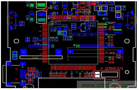 該產品只有一塊PCB,其上有一個12MHZ的晶體。其中超標頻點恰好都是12MHZ的倍頻,而分析該機器容易EMI輻射超標的屏和攝像頭,發現LCD-CLK是33MHZ,而攝像頭MCLK是24MHZ;通過排除發現去掉攝像頭后,超標點依然存在,而通過屏蔽12MZH晶體,超標點有降低,由此判斷144MHZ超標點與晶體有關,PCB布局如下: