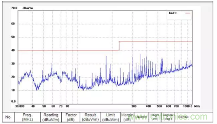 將晶振內移,使其離PCB邊緣至少1cm以上的距離,并在PCB表層離晶振1cm的范圍內敷銅,同時把表層的銅通過過孔與PCB地平面相連。經過修改后的測試結果頻譜圖如下,從圖可以看出,輻射發射有了明顯改善。