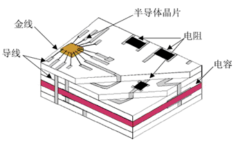 LTCC工藝流程見圖2。圖3為典型的LTCC基板示意圖,由此可知,采用LTCC工藝制作的基板具有可實現(xiàn)IC芯片封裝、內(nèi)埋置無源元件及高密度電路組裝的功能。