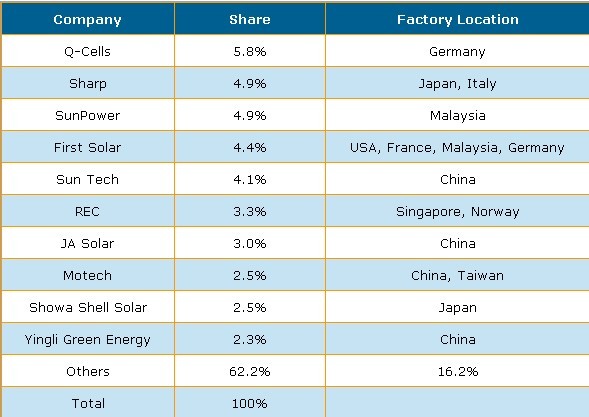 六 :依照2009年全球太陽能電池(Cell)的產(chǎn)能來看,F(xiàn)irst Solar 是最大廠商,其產(chǎn)能達到10億瓦(1 GW),Q-Cells 與 Suntech 并列第二。在接下來的數(shù)年之內(nèi),主要的設備投資亦由這些領導廠商所帶動。DisplaySearch預測到2013年,F(xiàn)irst Solar, Q-Cells, Suntech 等前三大廠商以及JA Solar, Motech, REC, SunPower, Yingli, Showa Shell Solar, and Sharp 等等會是全球前十大供貨商,合計產(chǎn)能將達16GW (160億瓦),將占2013年全球產(chǎn)能的38%。