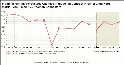 iSuppli公司認(rèn)為,第二季度訂單比第一季度增長15-16%,出貨量增長7-9%。這種趨勢與其它商品市場一致。但是,連接器領(lǐng)域補(bǔ)充庫存的勢頭不太強(qiáng)。圖5所示為亞洲每月連接器合同價格的百分比變動率,以代表市場趨勢的未來四個季度預(yù)測。