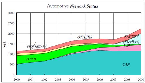 當(dāng)前汽車總線主要包括用于車身控制的CAN、LIN,用作底盤控制的FlexRay和信息娛樂系統(tǒng)中的IDB-1394和MOST。CAN依然占據(jù)汽車總線的主流地位,但是英飛凌車身電子系統(tǒng)市場部經(jīng)理李世銘在IATF2009上表示,低速CAN的市場份額將會逐步被LIN所占領(lǐng)。