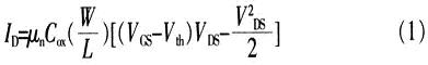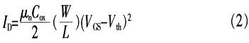 設(shè)置柵極寬度為W,有效柵極長度為L,柵極下氧化層的厚度為tOX。MOS管的特性方程為: