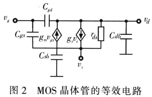 通過式(2)得到如圖2所示的MOS晶體管等效電路,其中壓控電流源gmVgs是模型中最重要的部分,晶體管的跨導(dǎo)gm定義為: