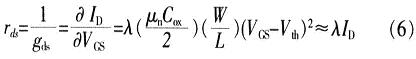 式中,γ是體效應(yīng)參數(shù),|2φF|為表面反轉(zhuǎn)電勢(shì)。圖2中,電阻rds表示有限輸出阻抗,模擬溝道長度調(diào)節(jié)和漏極電流因Vds改變而引起的效應(yīng),由式(1)可得: