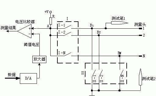 實現(xiàn)自動測量的前提是將被測元件引腳連入探測電路中,為此探測設備設置若干個測量頭,通過電纜引出,測量頭可掛接各種測試夾具與元件引腳建立連接,測量頭的數(shù)量決定了同一批連入探測電路的引腳數(shù)。然后在程序控制下探測儀按組合原則依次將被測"引腳對"一一納入測量通路。在測量通路中將"引腳對"之間的通/斷路狀況呈現(xiàn)為引腳間有無電阻,測量通路將其轉換為一個電壓量,由此判斷它們之間的通/斷路關系并加以記錄。