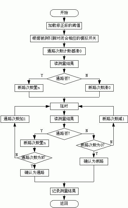 為了消除電容元件和模擬開關抖動的影響需要延長測量時間,而要消除電感元件的影響,則要利用感生電動勢在很短時間內確定,為此程序中設置了兩個計數(shù)器:通路次數(shù)計數(shù)器和斷路次數(shù)計數(shù)器。設置通路次數(shù)N是為了消除模擬開關閉合瞬間由于電容充電產生的假通路影響,即當累計讀得N次通路結果時,一般對電容的充電已結束,才確認被測量點間為通路。設置斷路次數(shù)n是為了排除模擬開關抖動所引起的干擾,一般在連續(xù)測得n次斷路結果時表明模擬開關的抖動已經(jīng)結束,才能確認為斷路。但因為電感的感生電動勢在模擬開關閉合瞬間最大,隨后迅速下降,所以如果第一次和第二次測量結果都為斷路,則確認為斷路。由于幾種情況之間互相矛盾,計數(shù)器及延時的值是在權衡三種情況的基礎上根據(jù)實際情況確定的。