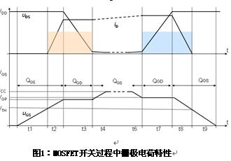 功率MOSFET管的柵極電荷特性如圖1所示,此特性圖可以在MOSFET數據表中查到,開通的工作過程可以參閱相關的文獻。值得注意的是:下面的開通過程對應著BUCK變換器上管的開通狀態,對于下管是0電壓開通,因此開關損耗很小,可以忽略不計。