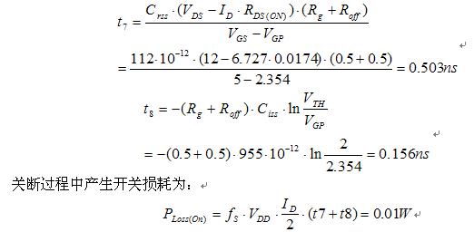 MOSFET開通損耗主要發生t2和t3時間段。下面以一個具體的實例下計算。輸入電壓12V,輸出電壓3.3V/6A,開關頻率350kHz,PWM柵極驅動器電壓為5V,導通電阻1.5Ohm,關斷的下拉電阻為0.5Ohm,所用的MOSFET為AO4468,具體參數如下:Ciss= 955pF,Coss= 145pF,Crss= 112pF,Rg= 0.5Ohm;當VGS= 4.5V,Qg= 9nC;當VGS=10V,Qg= 17nC,Qgd= 4.7nC,Qgs= 3.4nC;當VGS=5V且ID=11.6A,跨導gFS= 19S;當VDS=VGS且ID=250uA,,VTH= 2V;當VGS= 4.5V且ID=10A,RDS(ON)=17.4mOhm。