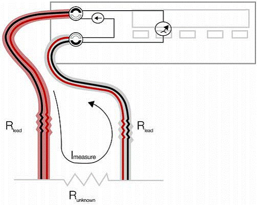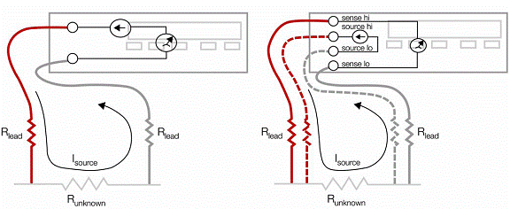 源端引線中的串聯電阻不影響電流流動。測量/傳感引線幾乎沒有電流流動,因為儀表的輸入阻抗很高。這意味著測量引線中沒有IxR電壓下跌。因此,您只需測量由于流經的源電流而在未知電阻器中產生的電壓下跌。