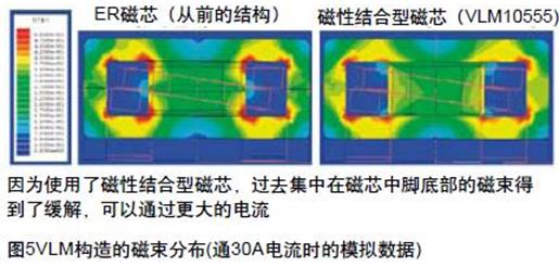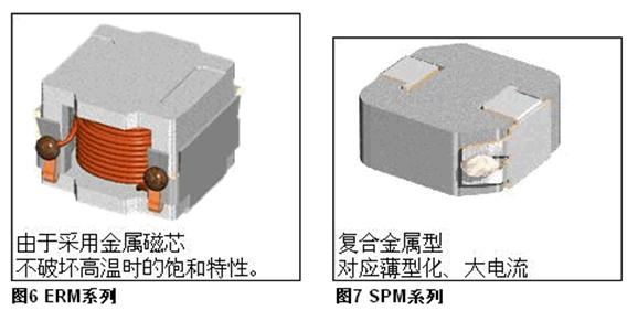 一直以來,一般的電感是以Ni-Zn系的鐵氧體作為磁芯的,這種材料雖然強(qiáng)度較高,但是飽和磁束密度較低,高溫時,飽和磁束密度會降低,在電子部件驅(qū)動日趨低電壓,大電流化的今日,這類小型化產(chǎn)品無法對應(yīng)大電流。要在高溫環(huán)境下通過更大的電流,就要使用由飽和磁束密度高且損耗小的Mn-Zn鐵氧體磁芯構(gòu)成的電感。一般而言,Mn-Zn鐵氧體材料的電感,磁芯的中腳部分會形成Gap,磁芯的中腳部分開始較容易飽和。如圖4 VLM所示,結(jié)構(gòu)是由口字形磁芯(磁性結(jié)合型磁芯)和棒狀磁芯組成。采用了這種構(gòu)造后,將本來容易產(chǎn)生飽和的中心磁芯的中腳部分分成上下兩部分,在上下根部形成Gap,不易出現(xiàn)部分飽和,能夠容許更大電流通過。另外,由于Gap分散在卷線的上下兩端,可以減少從Gap泄漏的磁束對卷線的影響。過電流損失減少,電源效率也提高了。再者,還可使用金屬磁芯的電感。它的飽和磁束密度更高,受溫度影響飽和電流的變化很少。如圖6 ERM6050所示。金屬磁芯的電感還有另外一款復(fù)合金屬型的電感(圖7 SPM系列)。
