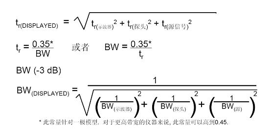以上公式中,Tr(display)表示實際測量到的信號上升時間,等于示波器上升時間、探頭上升時間和源信號上升時間的正交和。而系統(tǒng)的上升時間與帶寬的乘積為一常數(shù),對系統(tǒng)函數(shù)為1階的模型而言,該常數(shù)經(jīng)驗值為0.35,對于更高階的模型該常數(shù)介于0.35 ~ 0.5之間。 我們可以推導(dǎo)出這四者帶寬之間的關(guān)系。從以上公式我們還可以推導(dǎo)出:如果我們使用一臺100MHz的示波器和一個100MHz的探頭,那么它們組成的系統(tǒng)帶寬就小于100MHz,內(nèi)在的因素是因為探頭的電容和示波器的輸入電容相加,更大的電容導(dǎo)致更小的系統(tǒng)帶寬,加大了顯示在示波器屏幕上信號的上升時間tr。