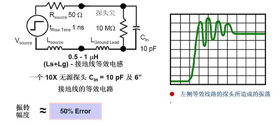 探頭接地引線實質(zhì)可以等效為電感效應(yīng),接地引線電感與探頭及示波器的輸入電容形成串聯(lián)諧振電路。而探頭的輸入電阻則在諧振電路中引入阻尼。電感效應(yīng)會造成阻抗不匹配,而且是帶寬越大影響就越大。等效電感的大小與接地線長度有關(guān),其越長電感效應(yīng)就越大,對波形的破壞效應(yīng)就是會產(chǎn)生脈沖信號的振蕩、過沖等信號完整性問題帶有接地引線電感的示波器探頭等效電路及效應(yīng)如下圖4。
