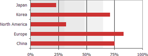 圖一 在32到42吋電視中采用USB playback的滲透率(按不同地區分布)