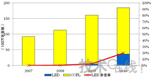 DisplaySearch發布的最新一期《季刊 配備LED背照燈的TFT LCD供貨調查報告》顯示,2009年配備LED背照燈的液晶電視面板供貨量大約達到了400萬張。