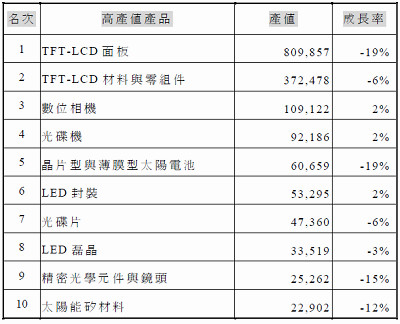 2009年臺灣地區(qū)1兆7,247億新臺幣的光電產(chǎn)值約相當522億美元,擁有16%的全球市場占有率。臺灣地區(qū)有幾項產(chǎn)品的世界占有率仍能維持全球前三大,包括LED芯片、LED封裝、TFT LCD材料與零組件、TFT LCD面板、數(shù)字相機代工、光驅(qū)與光盤片,和光學(xué)鏡片,以及結(jié)晶硅太陽電池等。與往年類似,這十大產(chǎn)品即占有臺灣地區(qū)整體光電產(chǎn)值的94%比例。