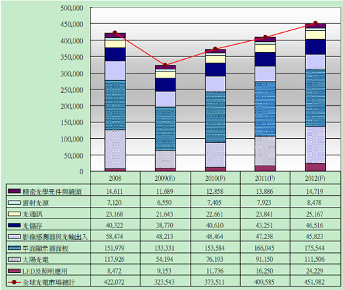 根據(jù)光電科技工業(yè)協(xié)進會(PIDA)的分析,2009年全球光電市場持續(xù)受到全球金融風(fēng)暴的影響,又從2008年的4,220億美元,大幅衰退了23%,跌到3,235億美元,可謂創(chuàng)下有史以來最大的跌幅;更甚于1997年的亞洲金融風(fēng)暴和2000年的通訊市場泡沫化。預(yù)期全球光電市場將會于2010年反彈,成長16%;亦高于以往的成長率,然后再以10%左右逐年回升。