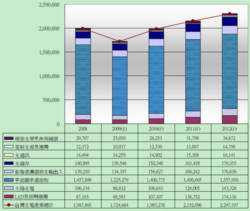 所幸景氣在2009年第一季跌到谷底之后便開始逐步回升,至第四季才確定恢復(fù)熱絡(luò)的景象。但是臺灣地區(qū)光電產(chǎn)業(yè)還是難抵金融風(fēng)暴的余威,整體產(chǎn)值下滑了13%,到1兆7,247億新臺幣。如原本所預(yù)估的,金融風(fēng)暴會犧牲掉兩年的成長率;保守預(yù)期臺灣地區(qū)光電產(chǎn)業(yè)將于2010年重拾成長,再度站回接近2兆新臺幣之規(guī)模。