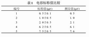 現對5個標稱值已知的片式電容在300M~3000MHz的頻率范圍內測量,所得數據與生產廠家給出的電容標稱值進行比較,如表1所示。