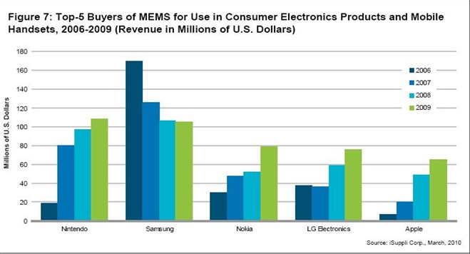 盡管任天堂在2007和2008年一直是消費電子領(lǐng)域中的第二大MEMS買家,但它在2009年增加了陀螺儀的購買量——用于測量或保持方向的MEMS傳感器,用于Wii Motion Plus配件。這導(dǎo)致任天堂2009年用于MEMS的支出從2008年的9700萬美元增加到1.08億美元,增長11.9%。