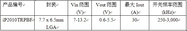 iP2010的輸入電壓范圍為7V至13.2V,輸出電壓范圍則為0.6V至5.5V,輸出電流高達30A。這個器件最高運行頻率為3MHz。在5MHz運行時,與iP2010引腳兼容的iP2011備有相同的輸入和輸出電壓范圍,但后者經過優化,從而使最高輸出電流高達20A。通過以通用占位面積提供多種電流額定值器件,IR提供的靈活性能夠滿足不同客戶對電流水平、性能和成本的要求。