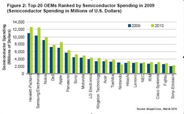 半導(dǎo)體OEM廠商的支出將增長到1779億美元,比2009年的1570億美元增長13%。在這些支出中,以惠普、三星、諾基亞和蘋果等巨頭為首的20大廠商,將占1037億美元或58%。這里所說的OEM支出增長,假定包括最終產(chǎn)品所包含的全部芯片,不管是通過什么渠道購買的——包括OEM直接采購,以及通過EMS或分銷商購買的芯片。