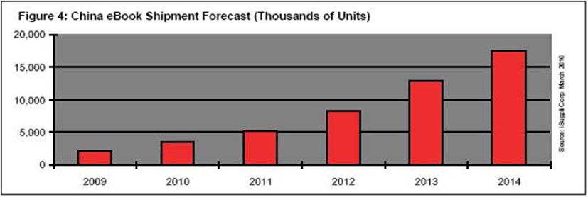 據iSuppli公司,2010年中國市場的電子書出貨量將達到360萬個,比2009年的210萬大增70.7%。到2014年,中國市場的電子書出貨量將達到1760萬個。