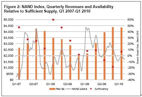 第一季度NAND平均價(jià)格下降4%,而2009年第四季度是下降1.4%。相比于這些相對(duì)溫和的變化,2009年第一季度大漲34%。