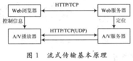 需要說明的是,在流式傳輸中,使用RTP/UDP和RTSP/TCP兩種不同的通信協(xié)議與A/V服務(wù)器建立聯(lián)系,是為了能夠把服務(wù)器的輸出重定向到一個不同于運(yùn)行A/VHelper程序所在客戶機(jī)的目的地址。實(shí)現(xiàn)流式傳輸一般都需要專用服務(wù)器和播放器,其基本原理如圖1所示。