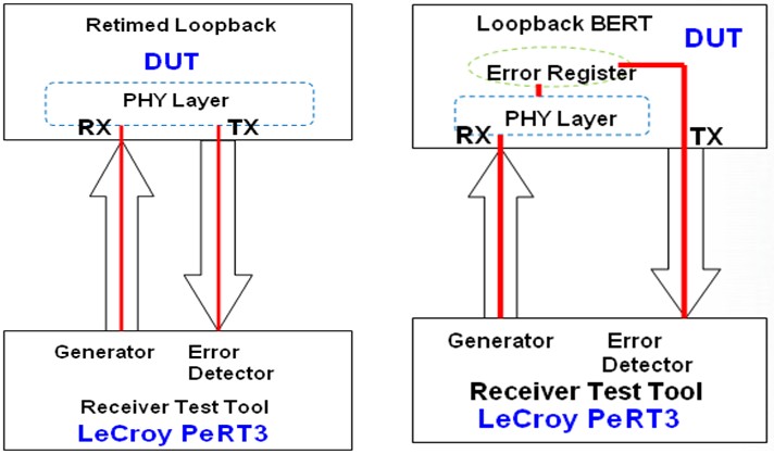 對于USB3.0的接收機測試還可以使用另一種方法:即Loopback BERT Method。如下圖7的右圖所示:DUT的接收端工作在Loopback BERT模式,直接分析BERT發(fā)送出的已知的測試碼流,對接收到的誤碼計數(shù),誤碼數(shù)量存入誤碼寄存器(如下圖7的Error Register),LeCroy PeRT3直接讀取誤碼寄存器,得到誤碼率和抖動容限測試結(jié)果。