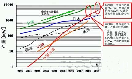 - 2000年以后,全球太陽能電池產量以年均40%左右的速度增長