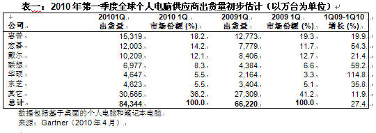 據Gartner發布的初步統計結果,2010年第一季度全球個人電腦出貨量已達到8,430萬臺,與2009年同期相比增長27.4%,這一結果超過了Gartner此前所作的22%的增長預測。