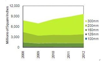 展望未來,300mm硅片增長達(dá)到61億MSI, 從2008年開始的年均增長率為12,4%。在同樣的期間內(nèi)200mm硅片將縮小到27MSI(CAGR為負(fù)2%) 。