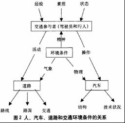 汽車道路交通事故是世界性的災害,因此汽車交通安全也是世界性的難題。道路交通事故引起人的傷亡,財產的損失,給國民經濟也帶來了巨大的損失。然而誘發交通事故的因素是多方面的,它受汽車行車速度、道路條件、車輛狀況、駕駛員行為、駕駛員的文化素質和自然環境等因素的綜合影響。其中人、汽車、道路、環境條件是影響道路交通安全的主要因素,它們之間的關系見圖2。
