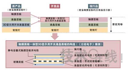 夏普的開發(fā)品將用于顯示3D映像的“開關(guān)液晶面板”與觸摸面板合為一體。該公司稱,通過這種方法,實(shí)現(xiàn)了與正面配備觸摸面板的現(xiàn)有2D液晶面板同等的厚度。(圖:上半部分根據(jù)夏普的資料制成,下半部分由《日經(jīng)電子》根據(jù)采訪內(nèi)容制成)