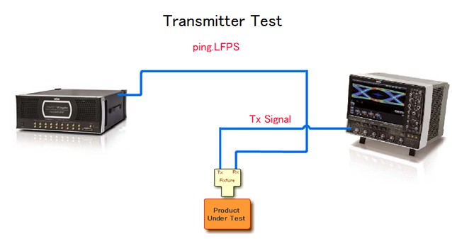 在TX測試時,信號的傳輸鏈路如圖7的上半部分所示,力科示波器通過USB電纜控制PeRT3,PeRT3通過同軸電纜向PUT的RX端發送Ping.LFPS,PUT的TX連接到示波器的通道。PeRT每發送一次Ping.LFPS,則PUT的TX發送的碼型在CP0到CP8之間切換一次(比如從CP0變為CP1,或從CP8變為CP0),這樣無需測試人員去配置PUT發送不同的測試碼型了,通過PeRT3,力科的QualiPHY軟件會自動控制PUT發送不同的測試碼型,完成TX的所有測試。