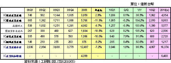 2010Q1由于全球景氣好轉,再加上新興市場需求持續強勁,所以呈現淡季不淡之情況。2010年第一季臺灣整體IC產業產值(含設計、制造、封裝、測試)達新臺幣3,846億元,較上季(09Q4)成長1.8%,較去年同期(09Q1)成長88.9%。其中設計業產值為新臺幣1,036億元,較上季(09Q4)成長0.1%,較去年同期(09Q1)成長38.5%;制造業為新臺幣1,885億元,較上季(09Q4)衰退0.2%,較去年同期(09Q1)成長134.2%;封裝業為新臺幣640億元,較上季(09Q4)成長7.9%,較去年同期(09Q1)成長91.0%;測試業為新臺幣285億元,較上季(09Q4)成長8.4%,較去年同期(09Q1)成長92.6%。
