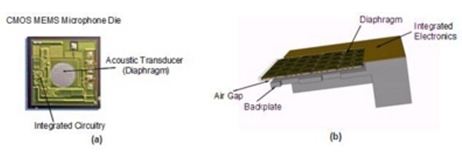 在CMOSMEMS平臺(tái)上開發(fā)的單塊集成電路硅晶麥克風(fēng)解決方案使消費(fèi)電子設(shè)備設(shè)計(jì)人員和制造商得以避免眾多ECM相關(guān)問題。下圖是一個(gè)單芯片硅晶麥克風(fēng)的俯視圖和橫截面圖。這一單塊芯片由MEM換能器(transducer)和阻抗匹配線路組成,它也是一個(gè)帶有可移動(dòng)振膜和剛性背板的電容性傳感器。