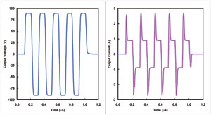 圖2±100V電源時(shí)典型的超聲波發(fā)送器輸出,以及流入100Ω和300pF并行負(fù)載的相應(yīng)瞬時(shí)電流