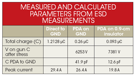 對充電到PDA的電流進行積分,可以得到從ESDqiang轉移到PDA的電荷數量。從ESDqiang轉移到PDA的電荷量可以用來計算ESDqiang的150pF電容上剩下的電壓,然后再算出PDA上的電壓。理解這個電壓以及PDA上測到的電荷之后,就可以計算出PDA和接地板之間的電容(見表1)。