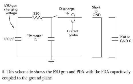 向PDA的放電通過一個并行平板電容表示,其中一個極板是PDA的一部分,另一個極板是接地板。在脈沖初期,PDA電容提供較低的阻抗,注入進PDA的電流近似于到地的放電電流。繼續施加脈沖,電荷在PDA到接地板電容中累積,因此PDA上的電位上升,直到PDA和接地板之間的電位和150pF電容上的電壓相等。這時,不再有電流流動,即使ESDqiang的電容還沒有完全放電。