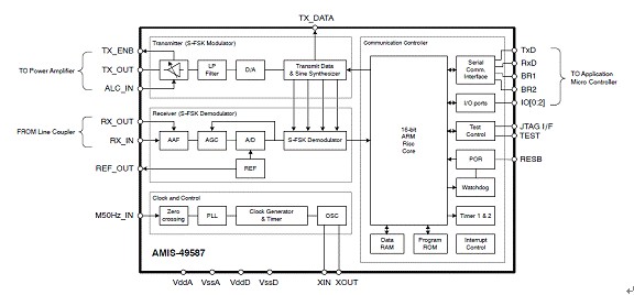 AMIS-49587符合IEC1334標準,有助于簡化設計、降低開發(fā)及應用成本,并加速上市進程。該器件基于ARM7TDMI處理器內核,包含物理接口收發(fā)器(PHY)和媒體訪問控制器(MAC)層,而大多數(shù)競爭方案都需要復雜的嵌入式軟件來執(zhí)行與AMIS-49587相同的功能。該器件采用擴頻型移頻鍵控(S-FSK)調制技術,結合精確的濾波,為長距離電力線提供可靠的低數(shù)據(jù)率通信,以及2,400 bps(波特)的半雙工可調節(jié)通信速率。不到20千赫(kHz)的低工作頻率配以自動中繼器(repeater)功能,令通信更可靠,通信誤差比其他及現(xiàn)有方案更低。圖3是AMIS-49587的方框圖。